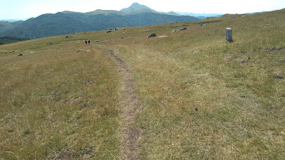 The hike continues along the border ridge but it's rounded now, and the ups and downs are more reasonable. It's very pleasant hiking but I'm keeping one eye on the clouds over in Spain and it's obvious there will be a storm this evening. There's a steep descent to the north of the ridge I can use to reach a dirt road leading to the cabane if the storm arrives too soon, but I continue along the ridge. When I arrive at the Col Elhurrosoko I head down to the cabane just as distant rumblings of thunder can be heard over in Spain.